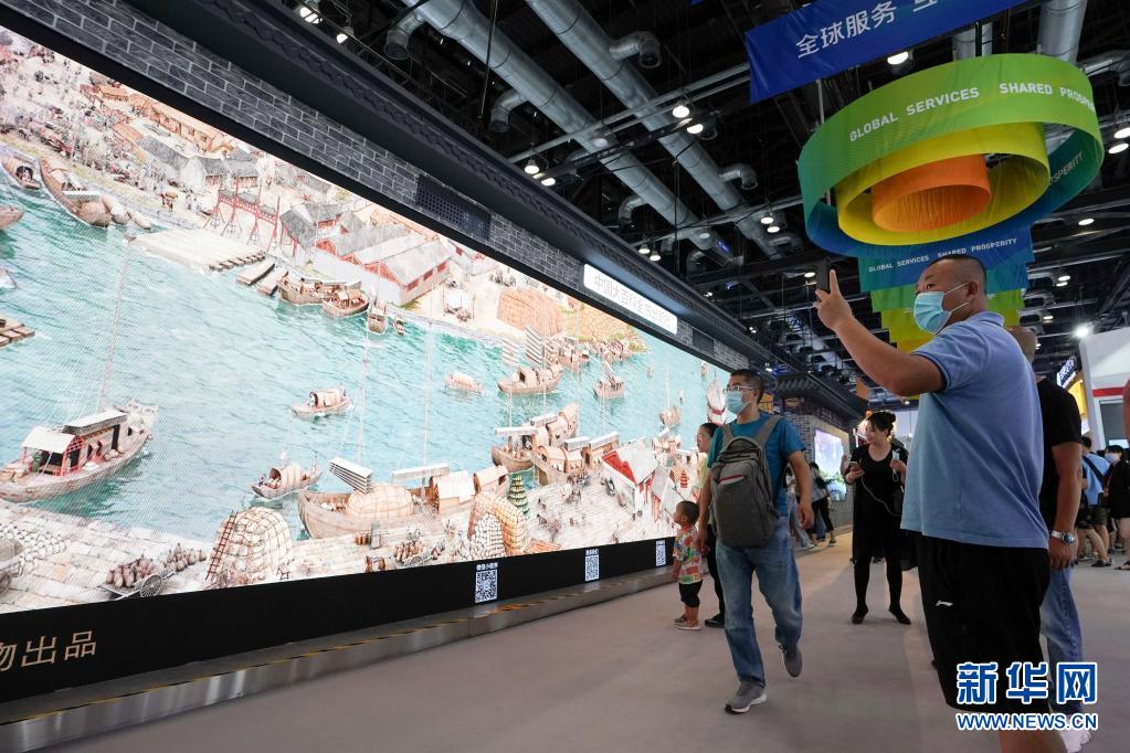 在2020年中國國際服務(wù)貿(mào)易交易會綜合展區(qū),參觀者在參觀展出的《穿越時空的大運河》數(shù)字影像(2020年9月6日攝)。新華社記者 鞠煥宗 攝