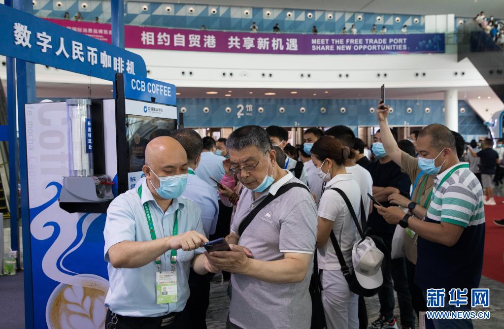 在??谂e行的首屆中國國際消費品博覽會上,參觀者體驗數(shù)字人民幣咖啡機(2021年5月10日攝)。新華社記者 金立旺 攝