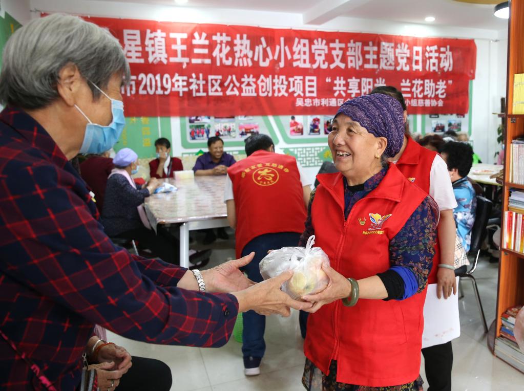 王蘭花(右)向來到蘭花志愿服務(wù)站參加活動(dòng)的老人發(fā)放“愛心水果”。(2020年6月23日攝)新華社記者賈浩成攝