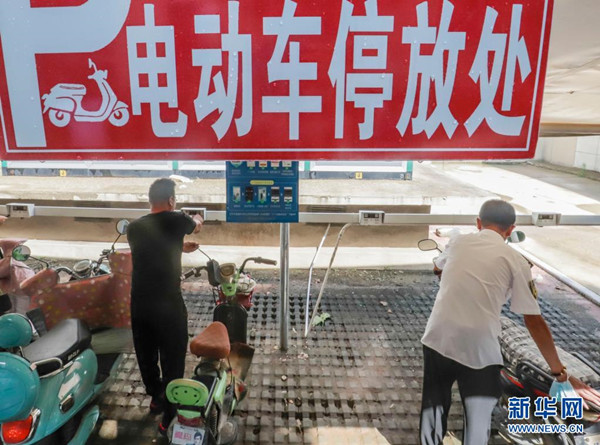 8月1日,在河北省遵化市一住宅小區(qū),業(yè)主將電動(dòng)車停放在集中停放處。