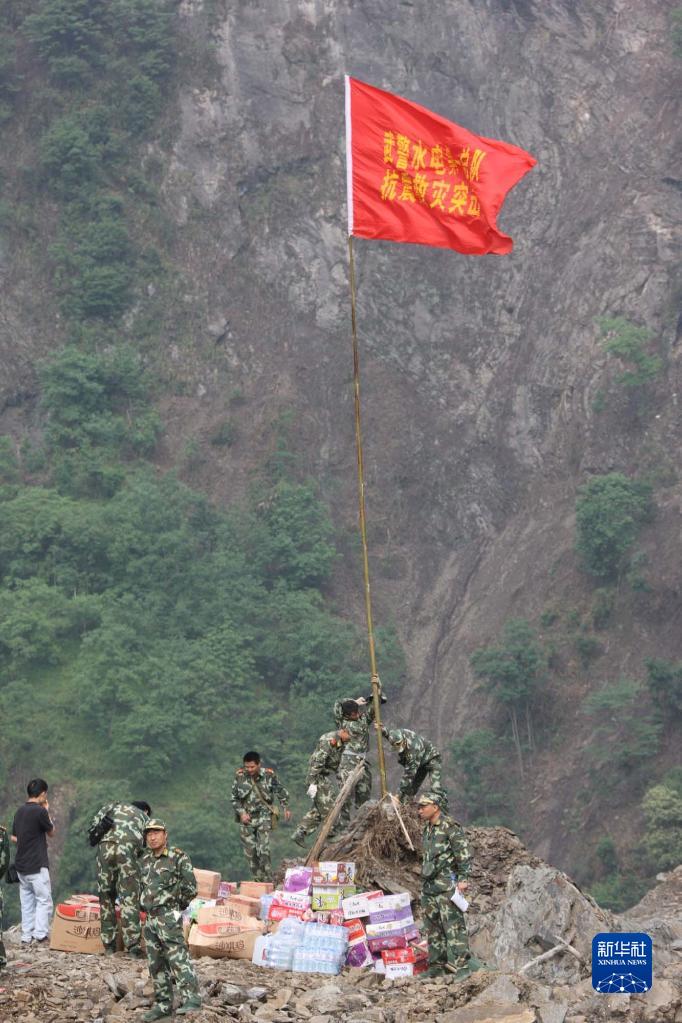 武警水電部隊官兵把紅旗豎起在唐家山堰塞湖搶險前沿(2008年5月26日攝)。新華社記者李剛攝