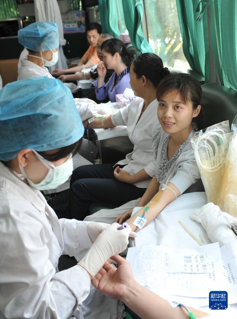 鄭州市委干部肖靜在流動獻血車上獻血(2008年5月14日攝)。2008年5月14日,數百名鄭州市直機關干部職工參加援助活動,并為汶川地震災區(qū)的受災群眾獻血。新華社記者 趙鵬 攝