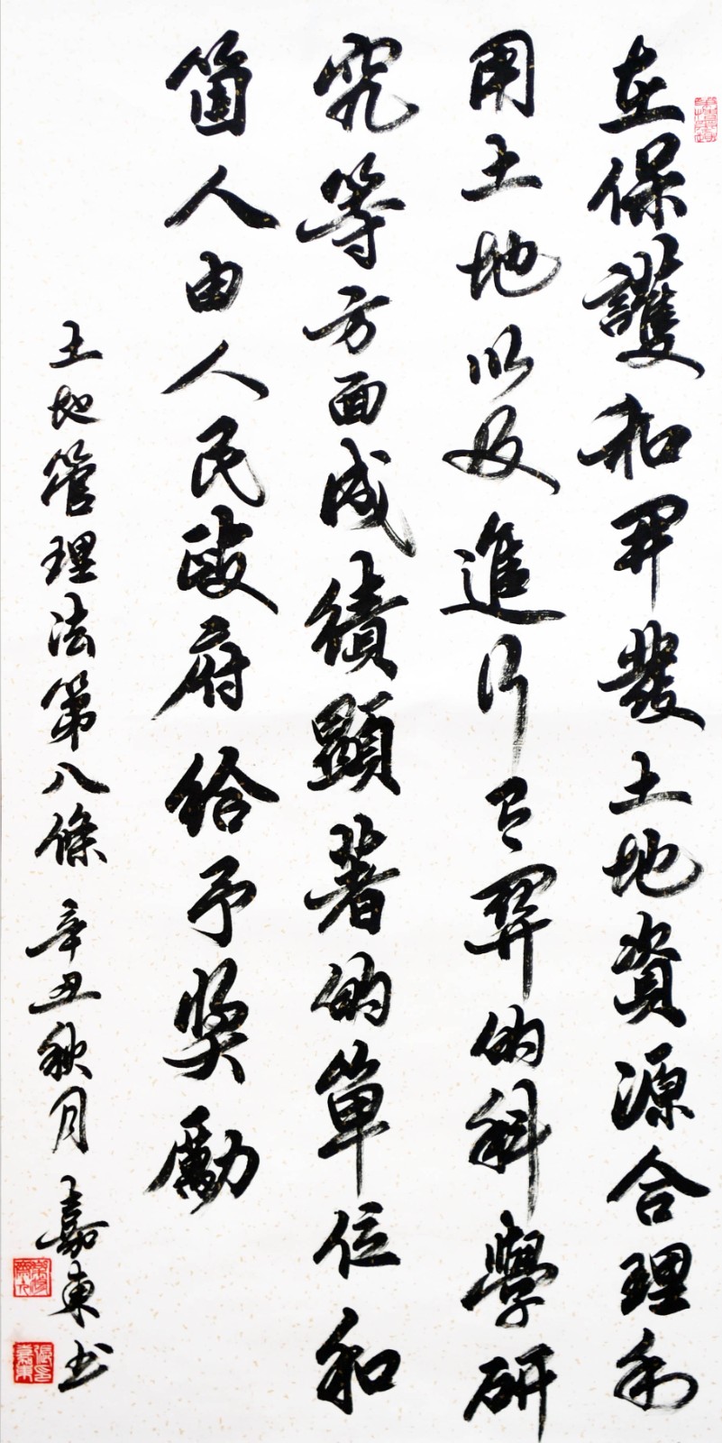 繼1600余位書法家參與書寫《中華人民共和國(guó)民法典》全部1260條法條之后,法治日?qǐng)?bào)社聯(lián)合自然資源部法規(guī)司、自然資源部書畫研究會(huì)和北京昌平書法家協(xié)會(huì),將筆端對(duì)準(zhǔn)土地管理“一法一條例”,即《中華人民共和國(guó)土地管理法》和《中華人民共和國(guó)土地管理法實(shí)施條例》。