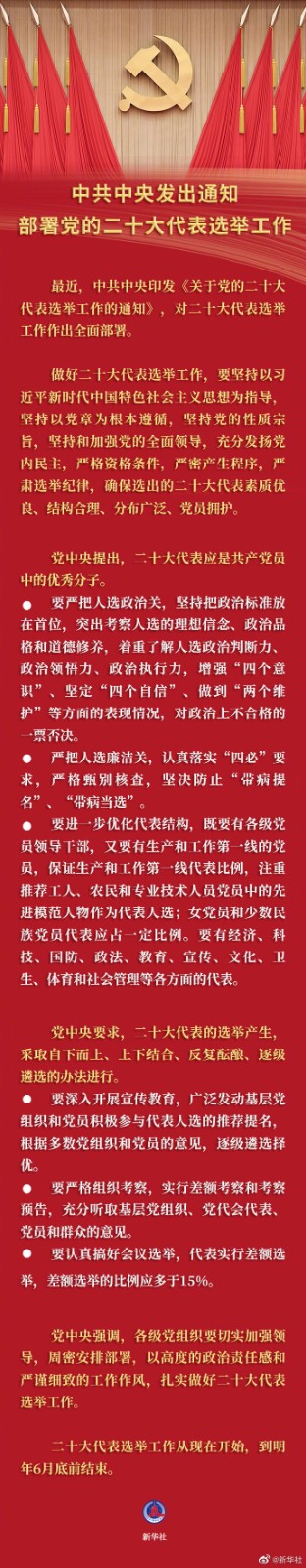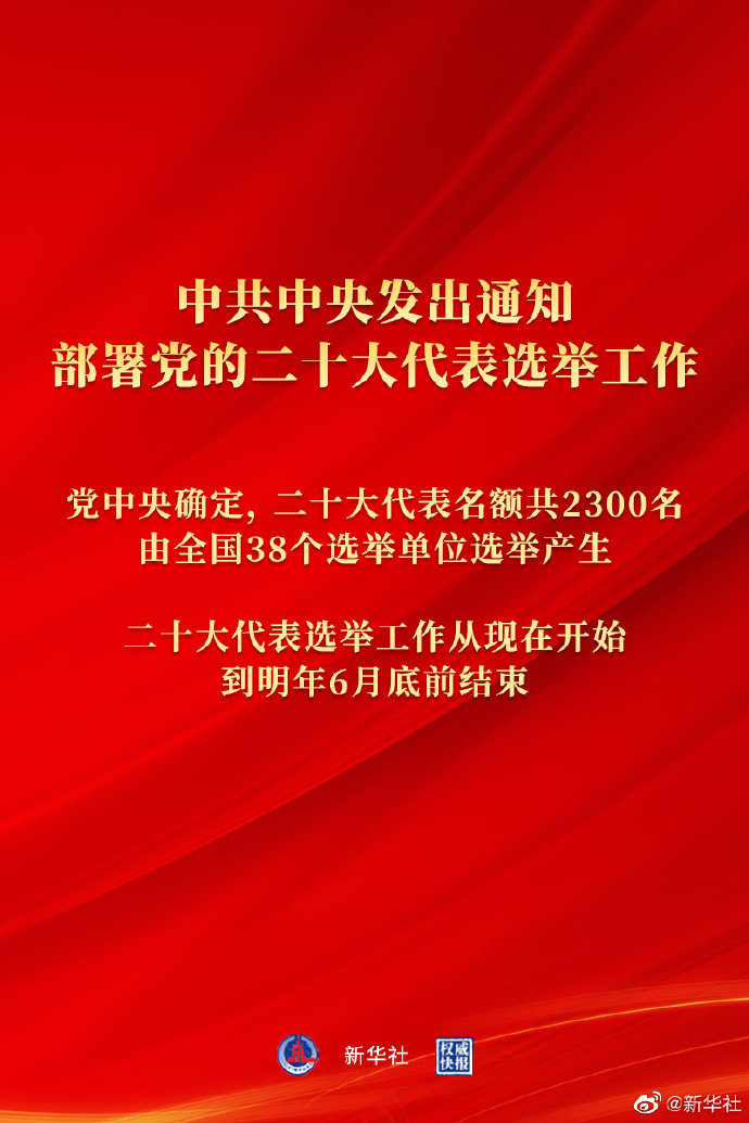 二十大代表選舉工作從現(xiàn)在開(kāi)始,到明年6月底前結(jié)束。