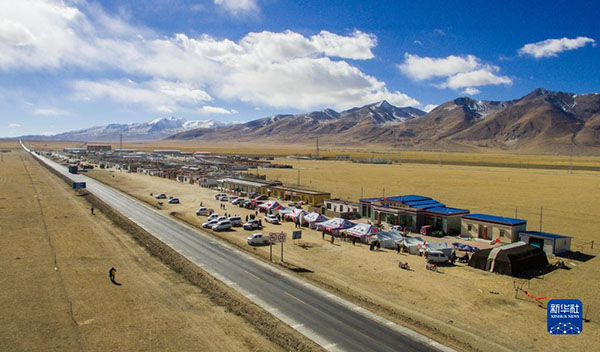 這是在青藏公路旁搭建的那曲縣香茂鄉(xiāng)畜產(chǎn)品展銷會(huì)(2017年11月25日攝,無(wú)人機(jī)照片)。新華社記者 劉東君 攝