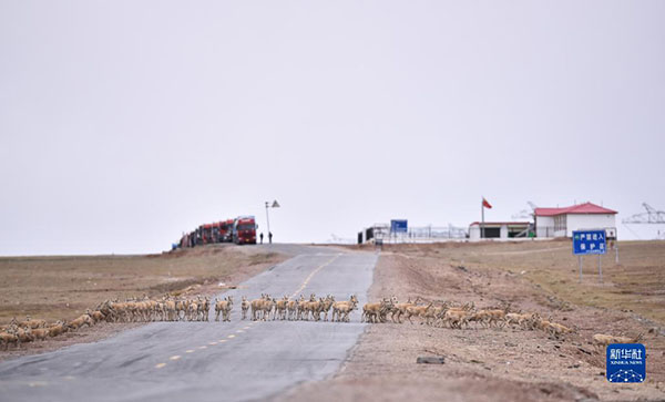 在青海可可西里,一群雌性待產(chǎn)藏羚羊正在通過青藏公路(2016年6月7日攝)。新華社記者 吳剛 攝