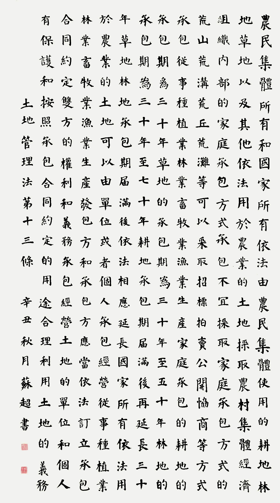 繼1600余位書法家參與書寫《中華人民共和國(guó)民法典》全部1260條法條之后,法治日?qǐng)?bào)社聯(lián)合自然資源部法規(guī)司、自然資源部書畫研究會(huì)和北京昌平書法家協(xié)會(huì),將筆端對(duì)準(zhǔn)土地管理“一法一條例”,即《中華人民共和國(guó)土地管理法》和《中華人民共和國(guó)土地管理法實(shí)施條例》。