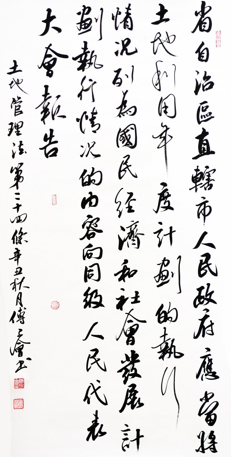 繼1600余位書法家參與書寫《中華人民共和國民法典》全部1260條法條之后,法治日報社聯(lián)合自然資源部法規(guī)司、自然資源部書畫研究會和北京昌平書法家協(xié)會,將筆端對準土地管理“一法一條例”,即《中華人民共和國土地管理法》和《中華人民共和國土地管理法實施條例》。
