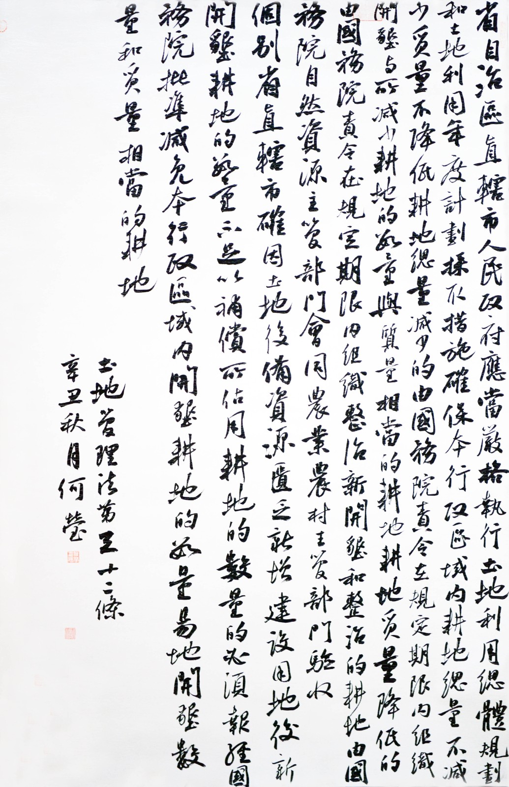 繼1600余位書法家參與書寫《中華人民共和國民法典》全部1260條法條之后,法治日報(bào)社聯(lián)合自然資源部法規(guī)司、自然資源部書畫研究會(huì)和北京昌平書法家協(xié)會(huì),將筆端對準(zhǔn)土地管理“一法一條例”,即《中華人民共和國土地管理法》和《中華人民共和國土地管理法實(shí)施條例》。