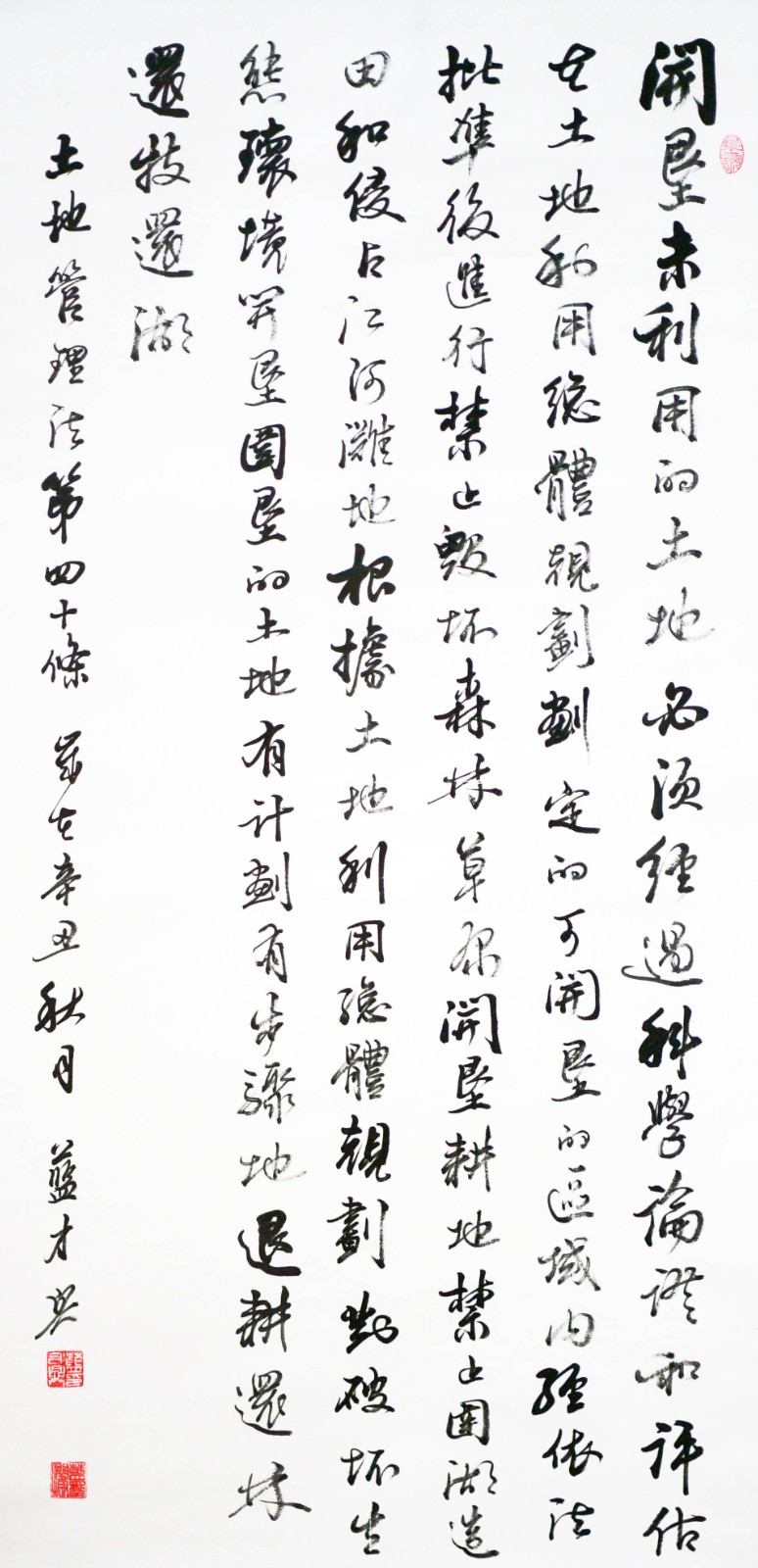 繼1600余位書法家參與書寫《中華人民共和國民法典》全部1260條法條之后,法治日?qǐng)?bào)社聯(lián)合自然資源部法規(guī)司、自然資源部書畫研究會(huì)和北京昌平書法家協(xié)會(huì),將筆端對(duì)準(zhǔn)土地管理“一法一條例”,即《中華人民共和國土地管理法》和《中華人民共和國土地管理法實(shí)施條例》。