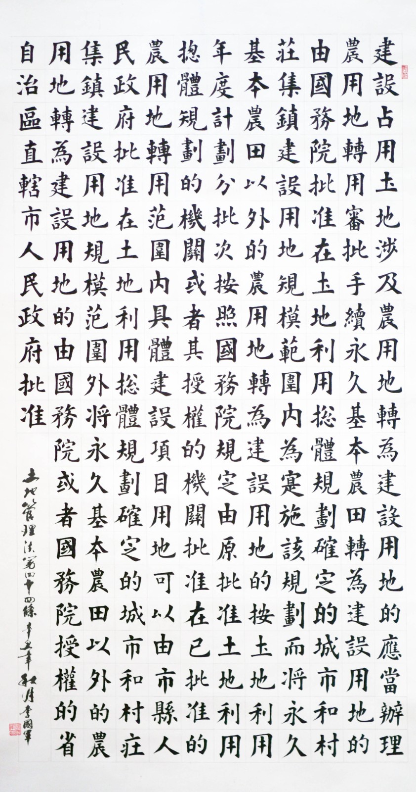 繼1600余位書法家參與書寫《中華人民共和國民法典》全部1260條法條之后,法治日報社聯(lián)合自然資源部法規(guī)司、自然資源部書畫研究會和北京昌平書法家協(xié)會,將筆端對準(zhǔn)土地管理“一法一條例”,即《中華人民共和國土地管理法》和《中華人民共和國土地管理法實施條例》。