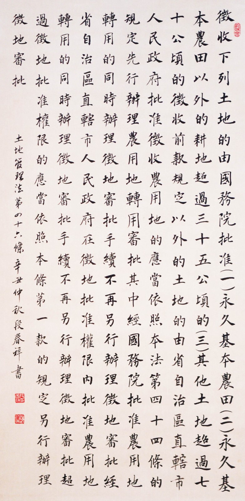 繼1600余位書(shū)法家參與書(shū)寫(xiě)《中華人民共和國(guó)民法典》全部1260條法條之后,法治日?qǐng)?bào)社聯(lián)合自然資源部法規(guī)司、自然資源部書(shū)畫(huà)研究會(huì)和北京昌平書(shū)法家協(xié)會(huì),將筆端對(duì)準(zhǔn)土地管理“一法一條例”,即《中華人民共和國(guó)土地管理法》和《中華人民共和國(guó)土地管理法實(shí)施條例》。