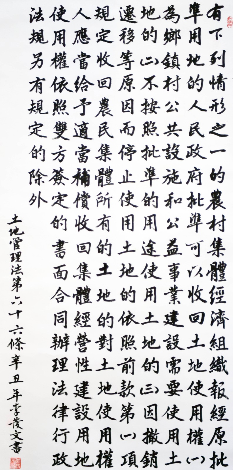 繼1600余位書法家參與書寫《中華人民共和國民法典》全部1260條法條之后,法治日報(bào)社聯(lián)合自然資源部法規(guī)司、自然資源部書畫研究會和北京昌平書法家協(xié)會,將筆端對準(zhǔn)土地管理“一法一條例”,即《中華人民共和國土地管理法》和《中華人民共和國土地管理法實(shí)施條例》。