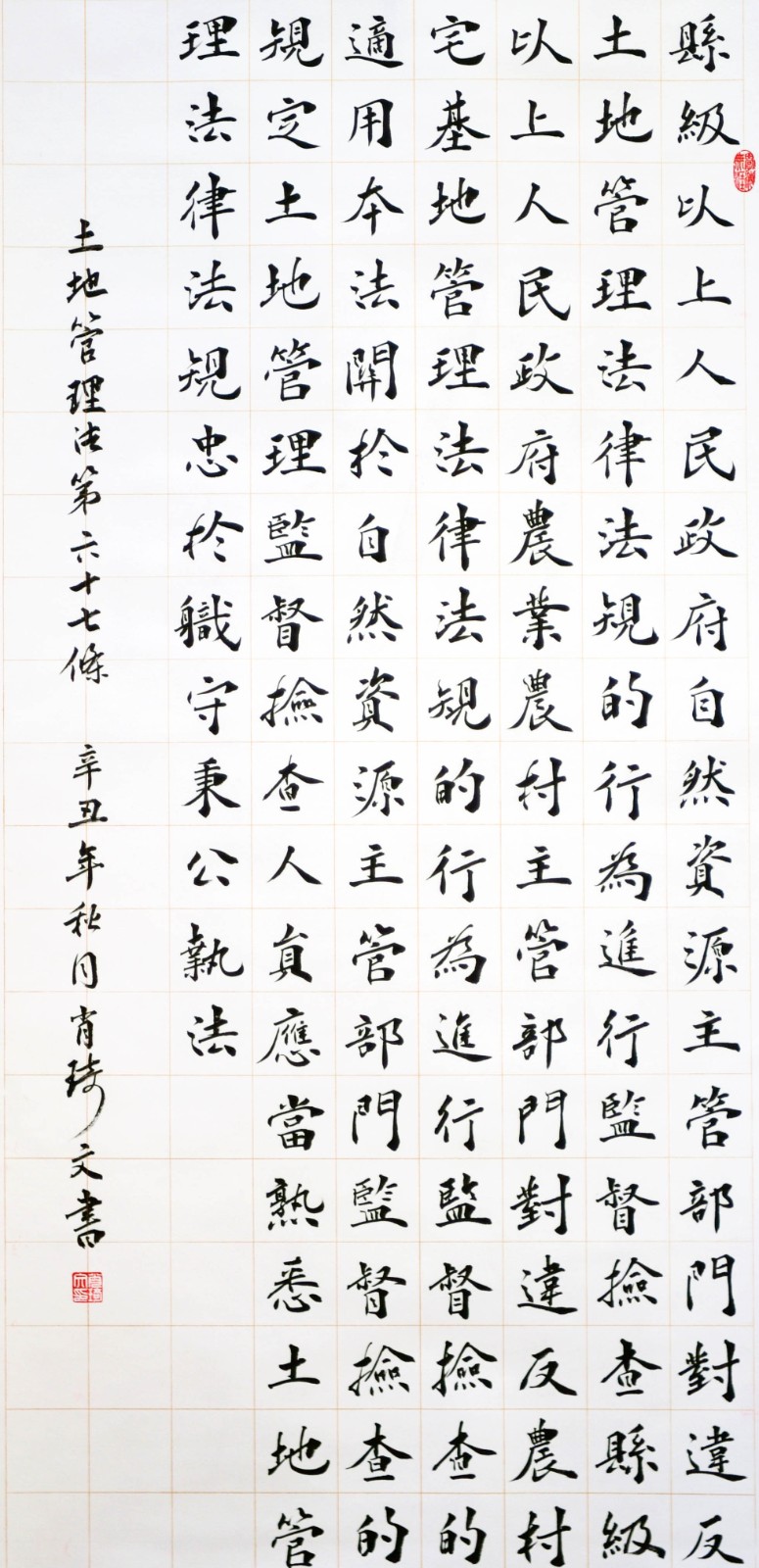 繼1600余位書(shū)法家參與書(shū)寫(xiě)《中華人民共和國(guó)民法典》全部1260條法條之后,法治日?qǐng)?bào)社聯(lián)合自然資源部法規(guī)司、自然資源部書(shū)畫(huà)研究會(huì)和北京昌平書(shū)法家協(xié)會(huì),將筆端對(duì)準(zhǔn)土地管理“一法一條例”,即《中華人民共和國(guó)土地管理法》和《中華人民共和國(guó)土地管理法實(shí)施條例》。