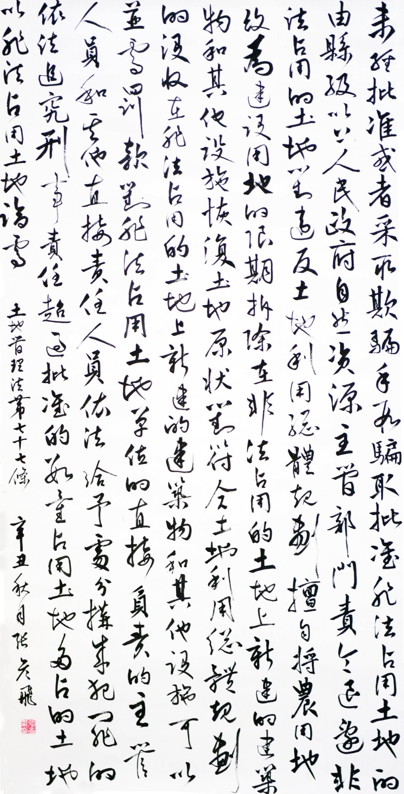 繼1600余位書法家參與書寫《中華人民共和國民法典》全部1260條法條之后,法治日?qǐng)?bào)社聯(lián)合自然資源部法規(guī)司、自然資源部書畫研究會(huì)和北京昌平書法家協(xié)會(huì),將筆端對(duì)準(zhǔn)土地管理“一法一條例”,即《中華人民共和國土地管理法》和《中華人民共和國土地管理法實(shí)施條例》。
