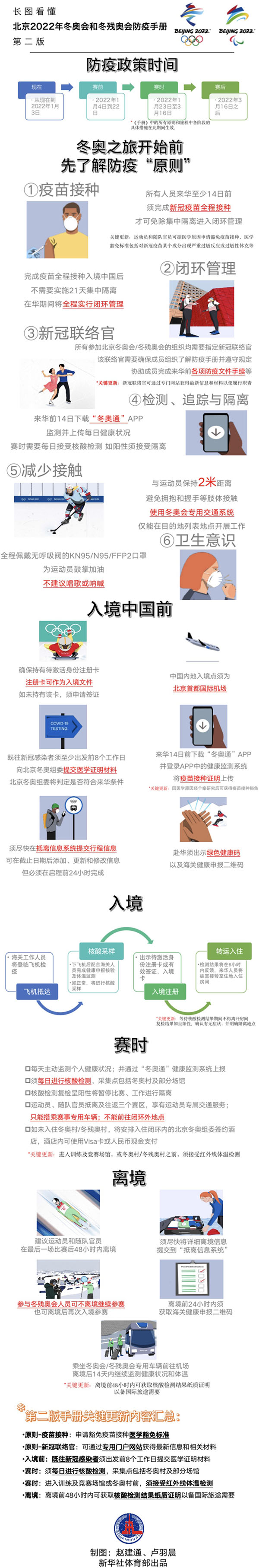 據(jù)悉,《防疫手冊(cè)》結(jié)合了中國(guó)的防疫政策,也結(jié)合了疫情下舉辦世界大型體育賽事的規(guī)律,從最初確定原則方針,到今年9月30日發(fā)布關(guān)鍵性政策,到10月25日發(fā)布第一版《防疫手冊(cè)》搭建四梁八柱,再到第二版《防疫手冊(cè)》將內(nèi)容更加細(xì)化,整個(gè)過程都是在防疫專家指導(dǎo)下,認(rèn)真研究各方面政策,與國(guó)際奧委會(huì)等有關(guān)各方密切磋商,最后形成的集體智慧。