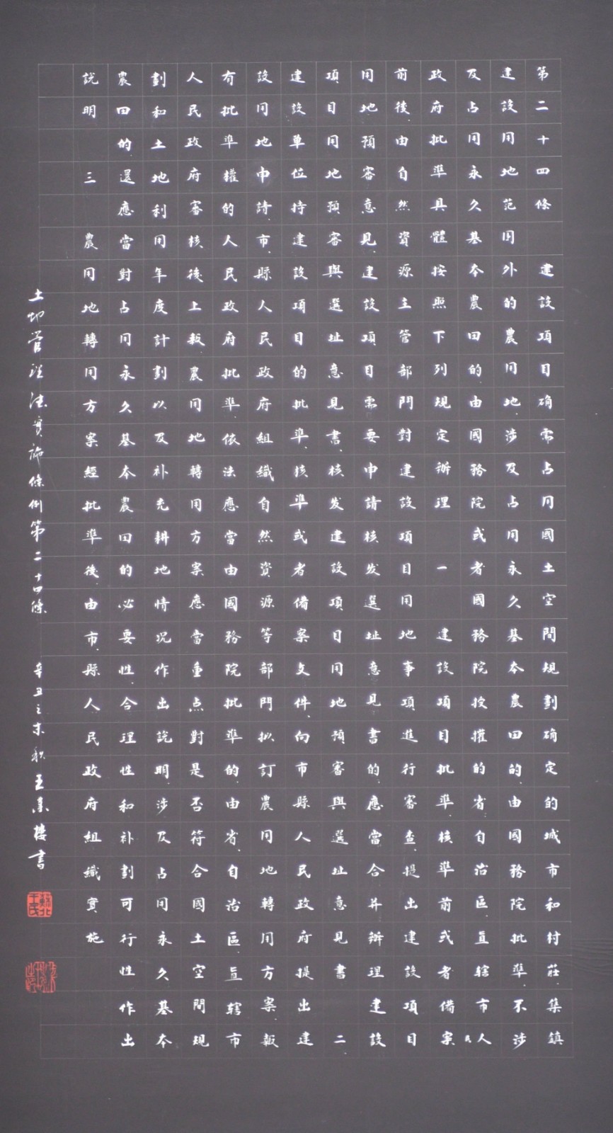 繼1600余位書法家參與書寫《中華人民共和國(guó)民法典》全部1260條法條之后,法治日?qǐng)?bào)社聯(lián)合自然資源部法規(guī)司、自然資源部書畫研究會(huì)和北京昌平書法家協(xié)會(huì),將筆端對(duì)準(zhǔn)土地管理“一法一條例”,即《中華人民共和國(guó)土地管理法》和《中華人民共和國(guó)土地管理法實(shí)施條例》。
