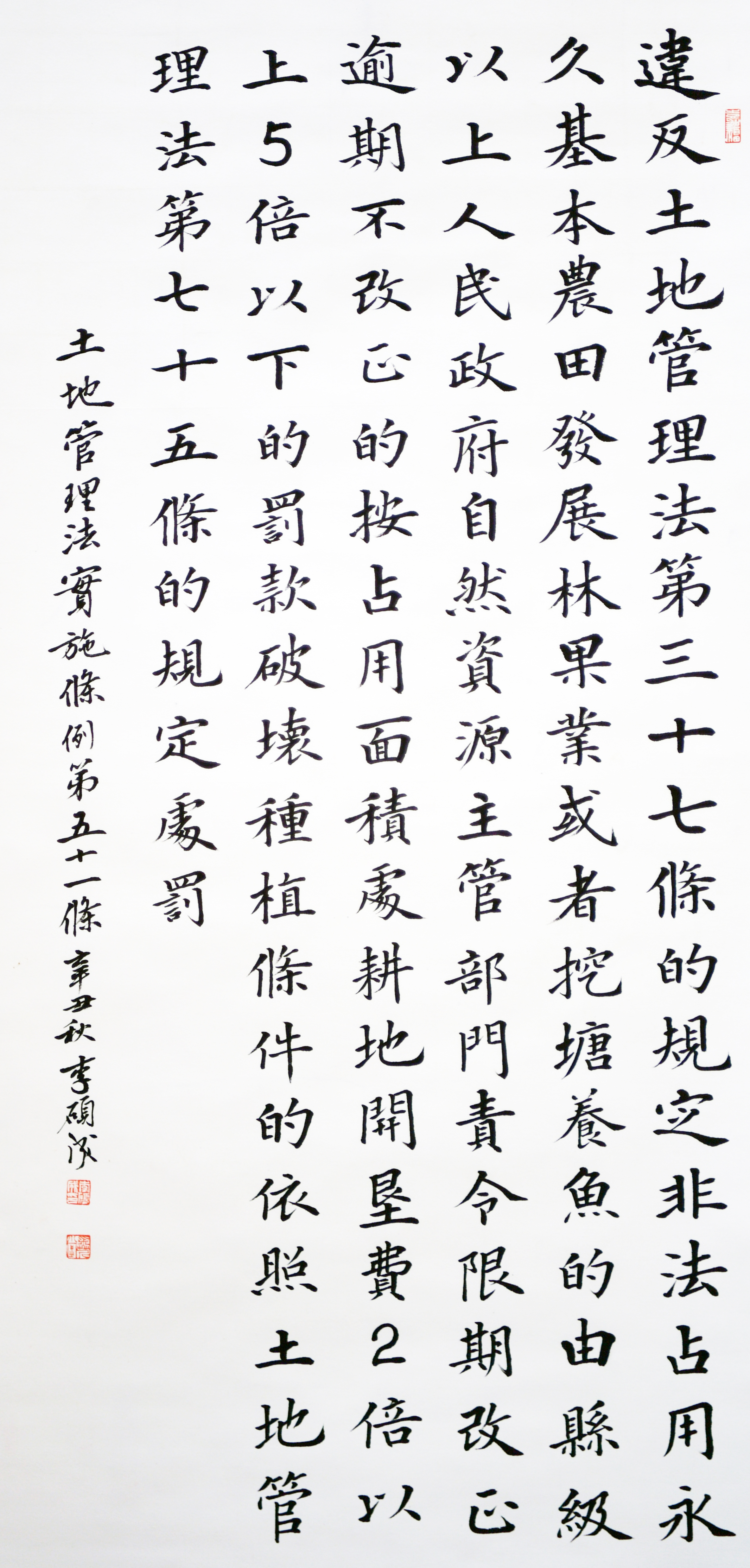 繼1600余位書法家參與書寫《中華人民共和國民法典》全部1260條法條之后,法治日報(bào)社聯(lián)合自然資源部法規(guī)司、自然資源部書畫研究會和北京昌平書法家協(xié)會,將筆端對準(zhǔn)土地管理“一法一條例”,即《中華人民共和國土地管理法》和《中華人民共和國土地管理法實(shí)施條例》。