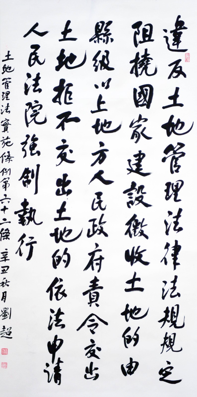 繼1600余位書法家參與書寫《中華人民共和國民法典》全部1260條法條之后,法治日?qǐng)?bào)社聯(lián)合自然資源部法規(guī)司、自然資源部書畫研究會(huì)和北京昌平書法家協(xié)會(huì),將筆端對(duì)準(zhǔn)土地管理“一法一條例”,即《中華人民共和國土地管理法》和《中華人民共和國土地管理法實(shí)施條例》。