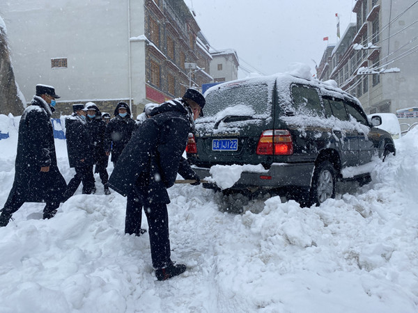 據(jù)了解,被困車輛是前來(lái)吉隆鎮(zhèn)旅游的,由于降雪過(guò)大導(dǎo)致最初車輛停放位置不易繼續(xù)停車,需要安全轉(zhuǎn)移,結(jié)果沒走幾米就被困在了十字路口。移民警察連忙上前合理分工,幫助鏟除積雪營(yíng)救被困車輛,同時(shí)疏散交通秩序,以免發(fā)生意外交通事故,不一會(huì)兒被困車輛就從雪堆里推了出來(lái)。