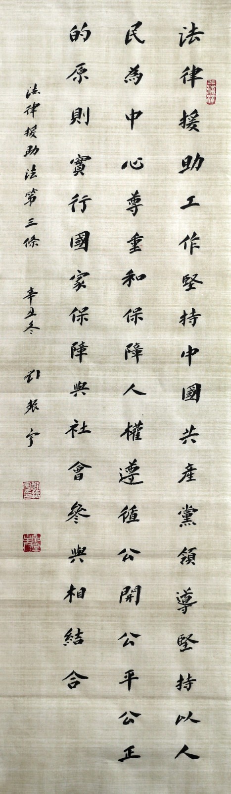 法律援助法第三條 法律援助工作堅持中國共產黨領導,堅持以人民為中心,尊重和保障人權,遵循公開、公平、公正的原則,實行國家保障與社會參與相結合。