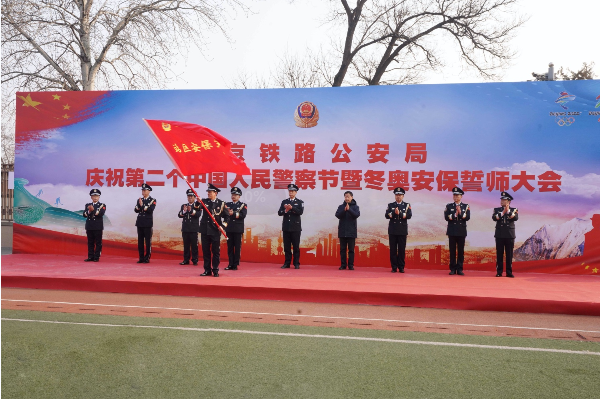 “我是中國人民警察,我宣誓.......”在北京鐵路公安局黨委書記、局長王旭章帶領(lǐng)下,110名干部民警代表組成“110”隊(duì)形,面向警旗,莊嚴(yán)宣誓,慶祝自己的節(jié)日。在隨后進(jìn)行的北京鐵路公安局冬奧安保誓師大會(huì)上,王旭章又分別為“黨員干部先鋒隊(duì)”“站區(qū)安保突擊隊(duì)”“線路防控突擊隊(duì)”“應(yīng)急處置突擊隊(duì)”和“賽時(shí)運(yùn)送護(hù)衛(wèi)隊(duì)”五支冬奧安保維穩(wěn)專業(yè)隊(duì)授旗,并代表北京鐵路公安局黨委莊重承諾:北京鐵路公安機(jī)關(guān)全體干部民警將以鐵路冬奧安?!爸鲌?、主責(zé)、主戰(zhàn)、主力”的政治站位和責(zé)任擔(dān)當(dāng),以“主戰(zhàn)用我,用我必勝”的戰(zhàn)斗意志和積極勇為,忠誠履責(zé)、踐行使命,堅(jiān)決確保轄區(qū)的絕對(duì)安全,在北京冬奧盛會(huì)中,展現(xiàn)北京鐵警風(fēng)采,奉獻(xiàn)忠誠與作為!