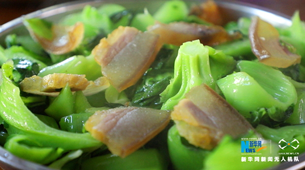 臘肉肉質(zhì)光亮有澤,呂田大芥菜炒臘味是過(guò)年招待客人的首選菜品之一。新華網(wǎng)發(fā)(羅素玲 攝)