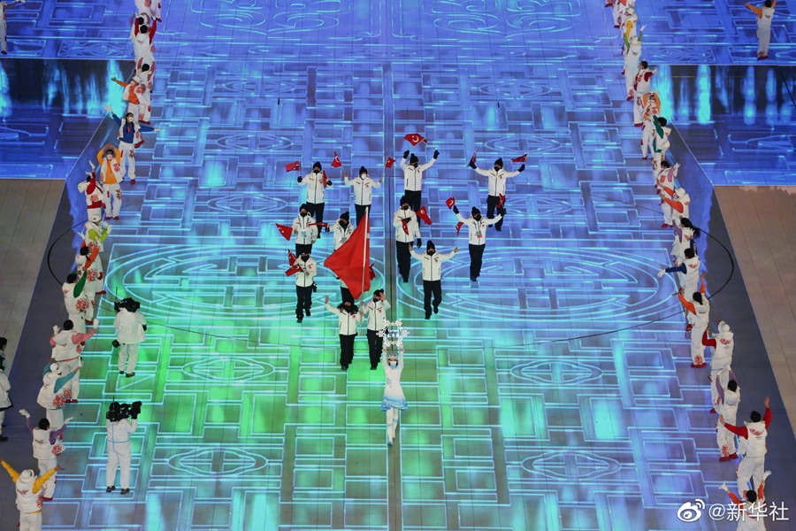運(yùn)動員走過冰雪雕刻的“中國門”和“中國窗”