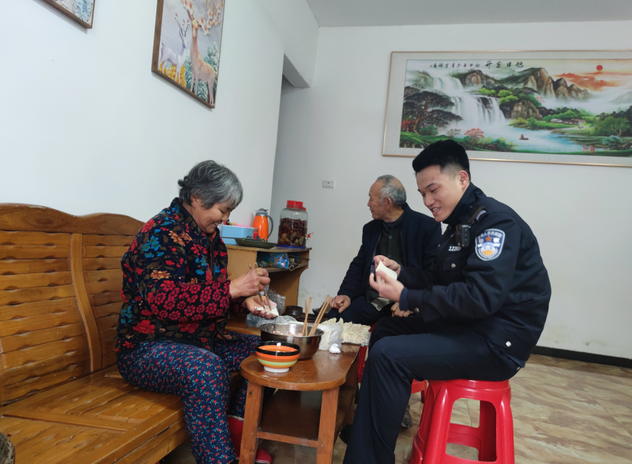 當(dāng)天上午,陳柳和輔警王強(qiáng)一起到天險(xiǎn)洞村六組劉得明家走訪。看到劉得明老伴正在包餃子,陳柳趕緊洗洗手坐下來幫忙。