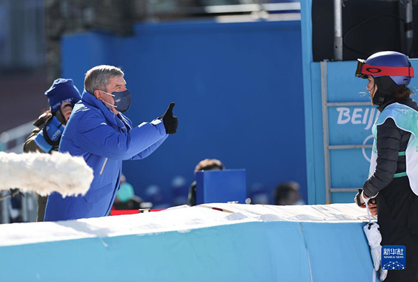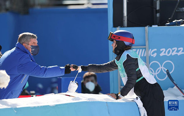 2月8日,國際奧委會主席巴赫(左)向中國選手谷愛凌表達祝賀。