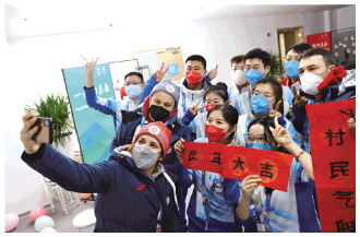 春節(jié)期間,北京冬奧會延慶賽區(qū)冬奧村里張燈結(jié)彩,志愿者和各代表團(tuán)成員相聚一堂,慶祝歡樂祥和的春節(jié)。圖為塞爾維亞代表團(tuán)成員和志愿者在延慶冬奧村合影留念。新華社發(fā) 肖紹雯 攝