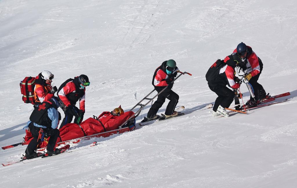2月10日,高山滑雪醫(yī)療隊隊員用雪橇船將瑞士高山滑雪選手揚尼克·夏布洛茨帶離賽道進行進一步救治。新華社記者陳斌攝
