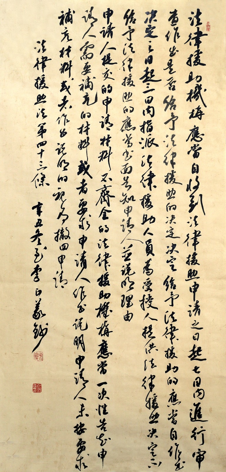 法律援助法第四十三條 法律援助機(jī)構(gòu)應(yīng)當(dāng)自收到法律援助申請(qǐng)之日起七日內(nèi)進(jìn)行審查,作出是否給予法律援助的決定。決定給予法律援助的,應(yīng)當(dāng)自作出決定之日起三日內(nèi)指派法律援助人員為受援人提供法律援助;決定不給予法律援助的,應(yīng)當(dāng)書面告知申請(qǐng)人,并說明理由。