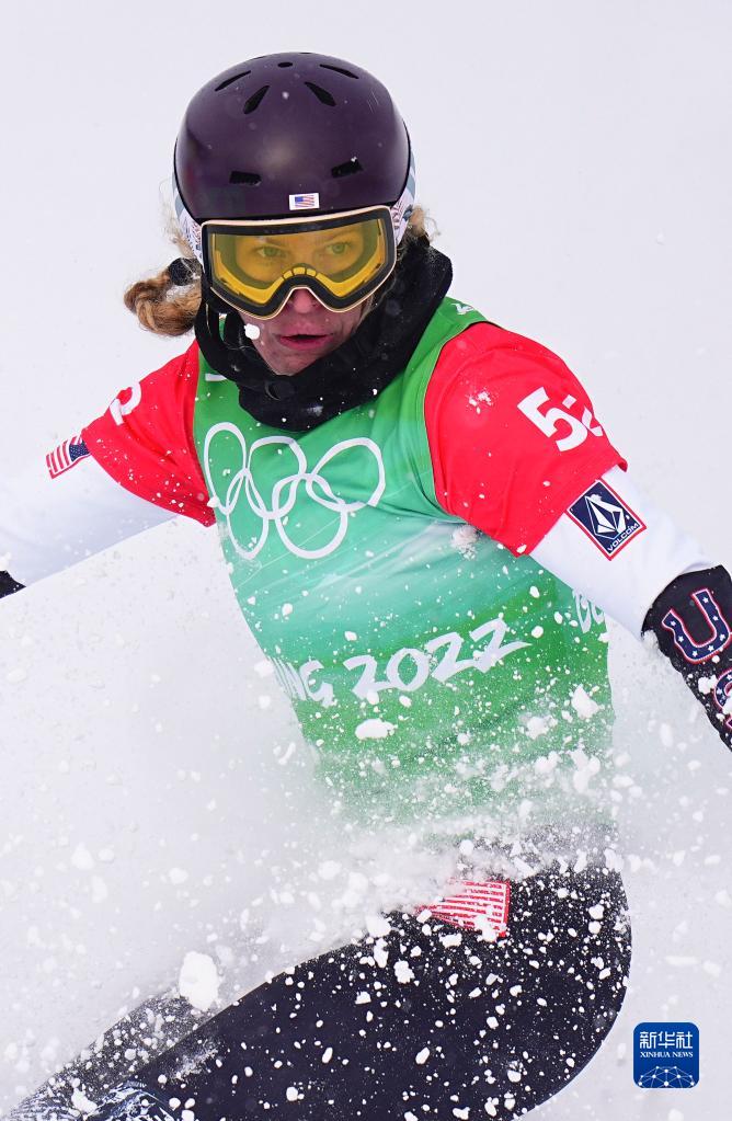 2月12日,美國選手琳賽·雅各貝利斯在比賽中。美國選手尼克·鮑姆加特納和琳賽·雅各貝利斯組成的美國一隊(duì)獲得單板滑雪障礙追逐混合團(tuán)體比賽的冠軍。新華社記者 許暢 攝