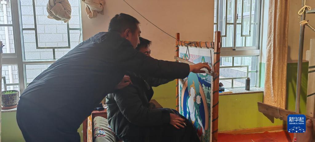 羅布斯達(dá)正在指導(dǎo)學(xué)生繪制唐卡。 新華社記者 范帆 攝