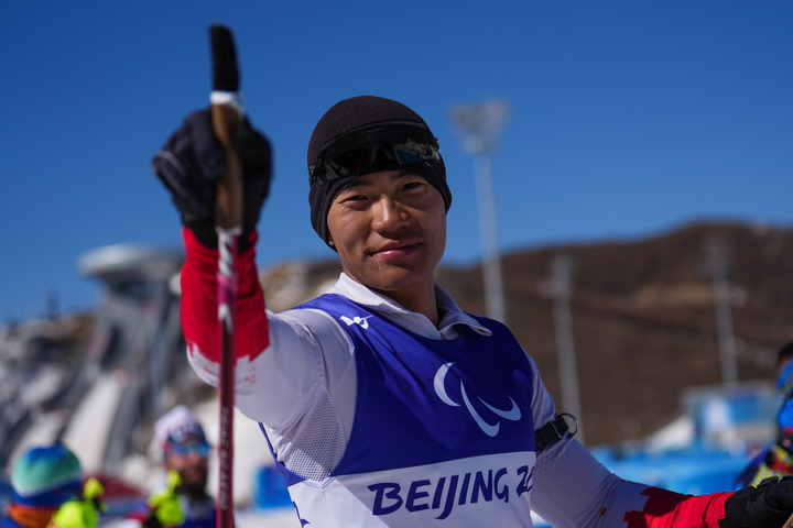 3月5日,中國選手劉子旭奪得北京冬殘奧會(huì)殘奧冬季兩項(xiàng)男子短距離(坐姿)比賽冠軍。新華社記者彭子洋攝