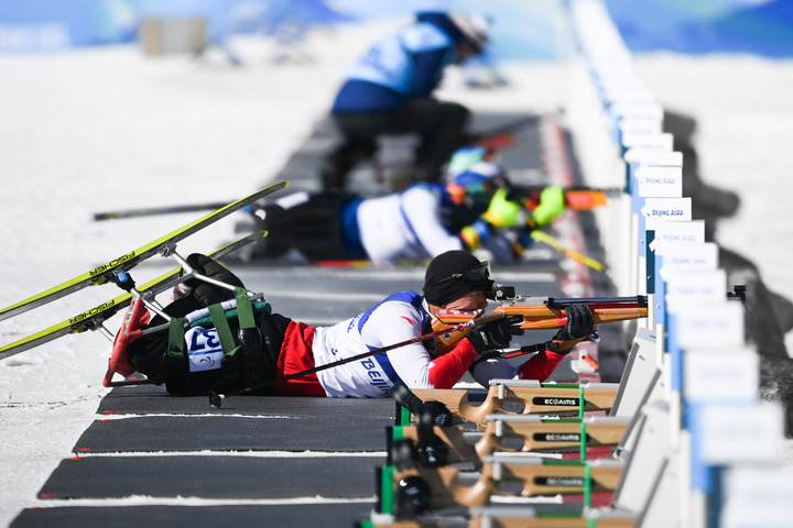 3月5日,中國選手劉子旭在北京冬殘奧會(huì)殘奧冬季兩項(xiàng)男子短距離(坐姿)比賽中。新華社記者薛宇舸攝