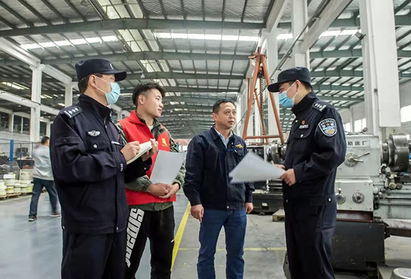 浙江省武義縣公安局熟溪派出所組建“紅風箏”助企服務(wù)驛站,切實為轄區(qū)企業(yè)做好外來人口服務(wù)管理工作,及時排查化解企業(yè)員工間的矛盾糾紛,組織平安志愿者開展護企巡邏,為企業(yè)發(fā)展提供良好治安環(huán)境。圖為民警走訪企業(yè)了解治安情況。 徐文榮 攝