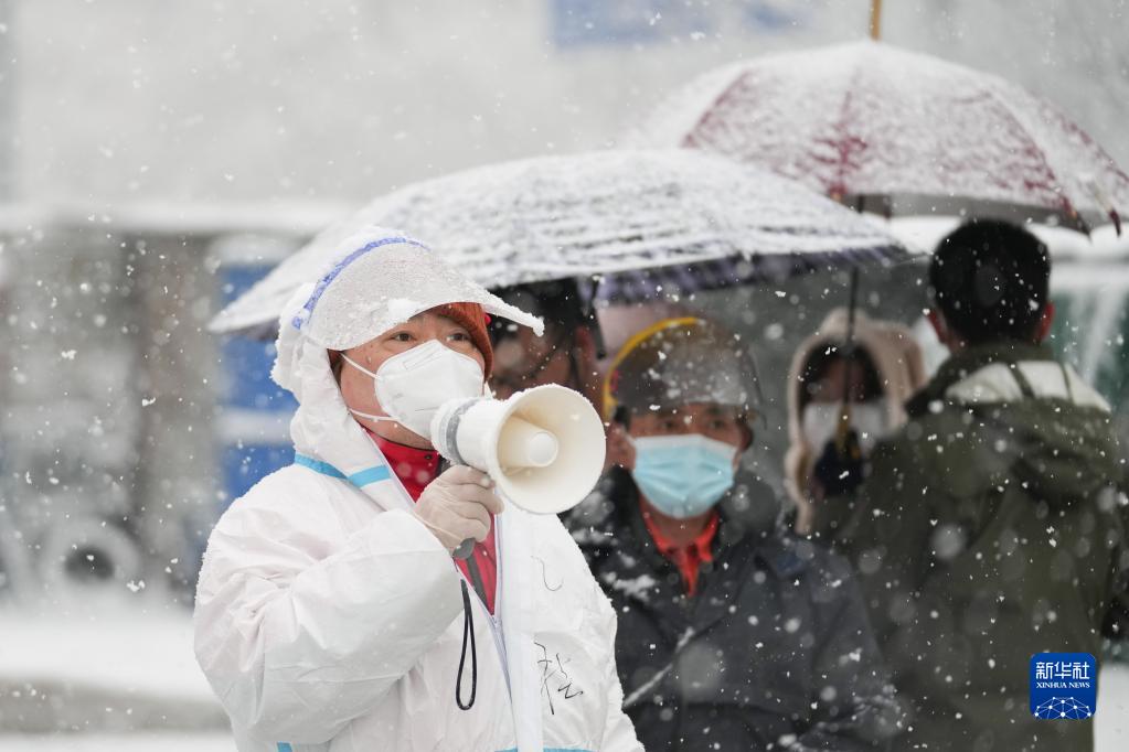 3月18日,在北京市東城區(qū)北新橋街道一處核酸采樣點,工作人員冒雪引導前來檢測的居民。新華社記者 鞠煥宗 攝