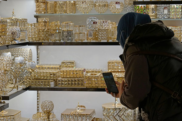 義烏國際商貿(mào)城一家水晶商鋪內(nèi),業(yè)務(wù)員小丁正在貨架前進(jìn)行遠(yuǎn)程視頻連線,手機(jī)的另一頭連著巴勒斯坦。受疫情影響,海外客商來華不便,遠(yuǎn)程直播成為其采購之“眼睛”?!翱蛻魮?dān)心這個(gè)燈臺(tái)尺寸比較大,運(yùn)費(fèi)會(huì)不會(huì)比較貴?”業(yè)務(wù)員小丁問?!皼]問題,主體和燈座可以拆卸,包裝不占空間。”商鋪負(fù)責(zé)人劉榮斌立即回復(fù)。
