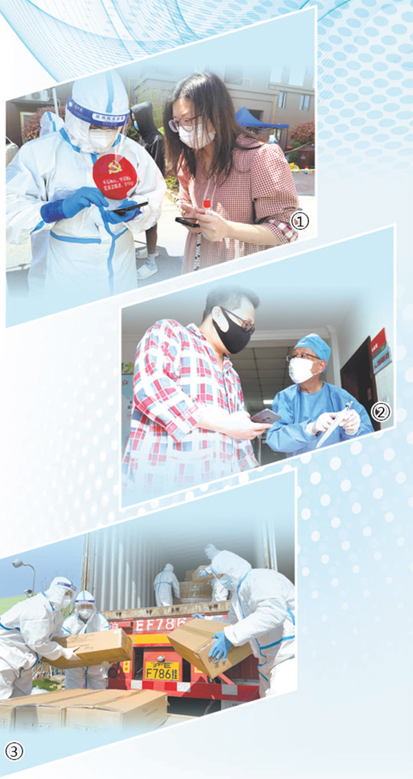 圖①:上海市浦東新區(qū)惠南鎮(zhèn)建欣苑臨時黨支部黨員(左)在核酸檢測現(xiàn)場給居民掃碼。方宏生攝(人民視覺)