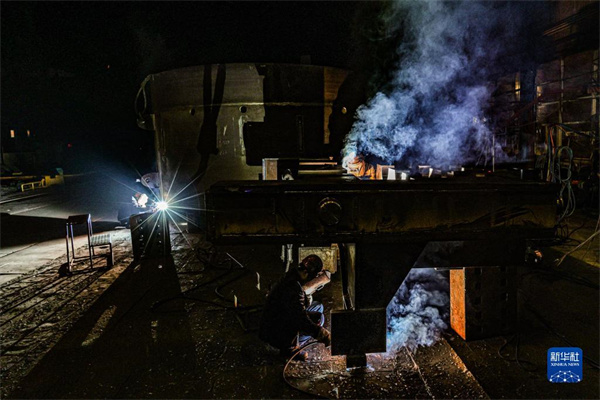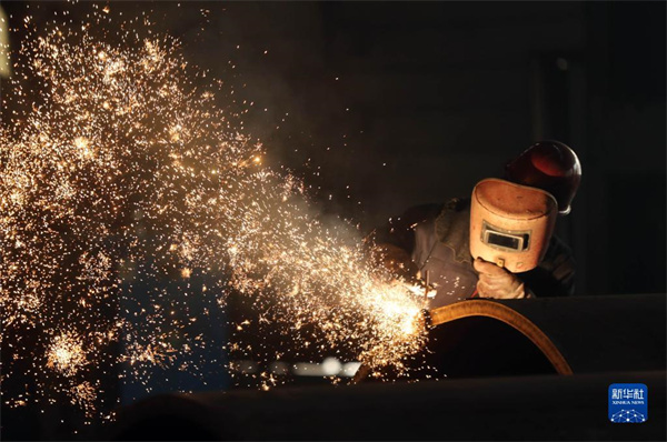 在沈陽(yáng)北方重工集團(tuán)有限公司,工人在車間焊接產(chǎn)品(2022年3月24日攝)。 新華社發(fā)