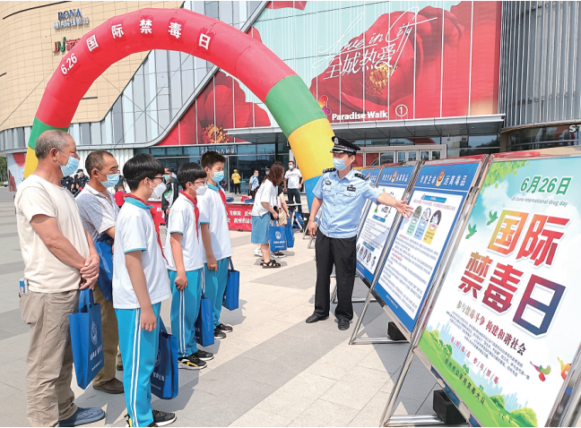 在“6·26”國際禁毒日即將來臨之際,6月11日,山東省膠州市委政法委、市人民法院、市人民檢察院、市教育和體育局、市公安局、市婦女聯合會、市公證處、市法學會等部門在膠州市龍湖天街廣場聯合開展禁毒宣傳活動,進一步推進禁毒宣傳,營造“社會群眾齊齊參與,禁毒知識人人知曉”的全民禁毒良好氛圍。圖為膠州市公安局禁毒大隊民警向群眾講解禁毒知識。