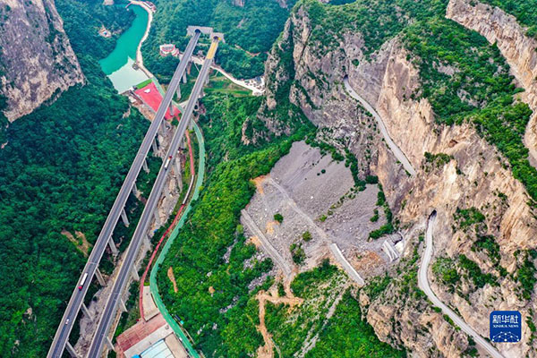 這是通過(guò)山西省長(zhǎng)治市平順縣虹梯關(guān)鄉(xiāng)的高速公路(畫面左側(cè)),一旁是過(guò)去的“掛壁公路”(畫面右側(cè))(2022年7月5日攝,無(wú)人機(jī)照片)。新華社記者 曹陽(yáng) 攝