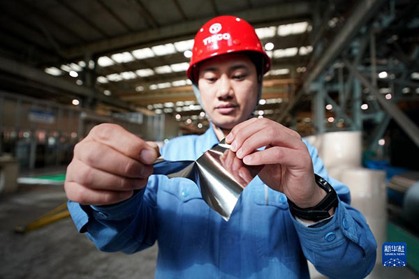 在中國(guó)寶武太鋼不銹鋼精密帶鋼有限公司,一名工作人員展示用手撕開(kāi)超薄精密不銹帶鋼(2022年3月31日攝)。新華社記者 詹彥 攝