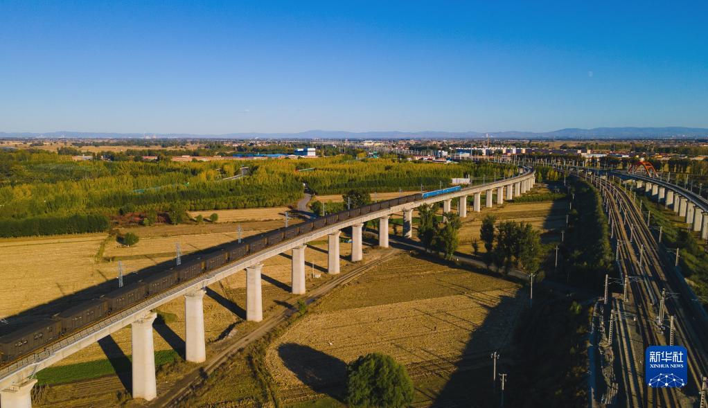 這是在內(nèi)蒙古呼和浩特拍攝的運(yùn)煤專(zhuān)列(2021年10月15日攝,無(wú)人機(jī)照片)。新華社發(fā)(夏亮 攝)