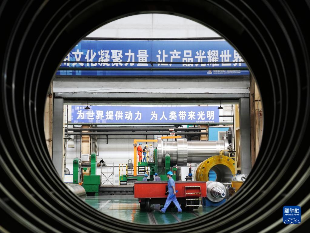 在哈電集團(tuán)哈爾濱電機(jī)廠有限責(zé)任公司車間,工人進(jìn)行生產(chǎn)作業(yè)(2022年6月27日攝)。新華社記者 王建威 攝