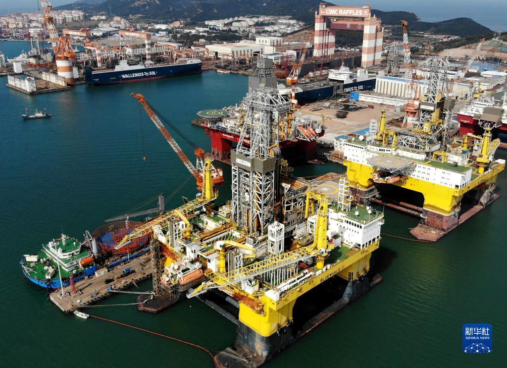 這是“藍(lán)鯨1號”(前右)及姊妹平臺“藍(lán)鯨2號”(前左)在其生產(chǎn)基地中集來福士海洋工程有限公司煙臺基地進(jìn)行維護(hù)和保養(yǎng)(2021年10月18日攝,無人機(jī)照片)。新華社記者 李紫恒 攝