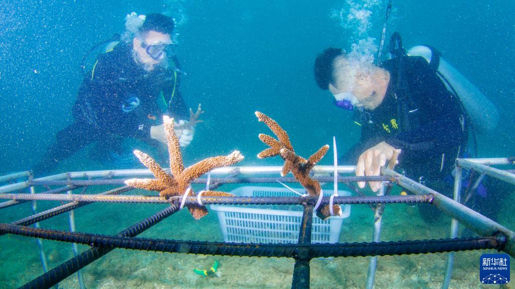 海南省海洋與漁業(yè)科學研究院的專家和分界洲島旅游區(qū)工作人員在海南省陵水黎族自治縣分界洲島附近海域移植珊瑚(2022年6月7日攝)。新華社記者 張麗蕓 攝
