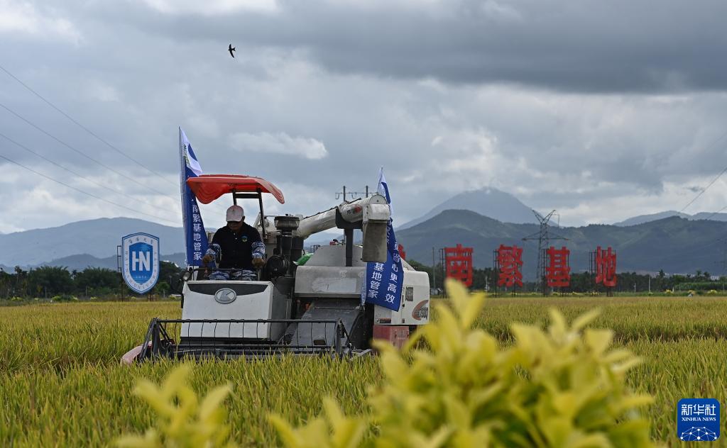 在三亞市崖州區(qū)(壩頭)南繁公共試驗基地試驗示范點稻田,工作人員操作收割機收割水稻(2022年5月6日攝)。新華社記者 楊冠宇 攝